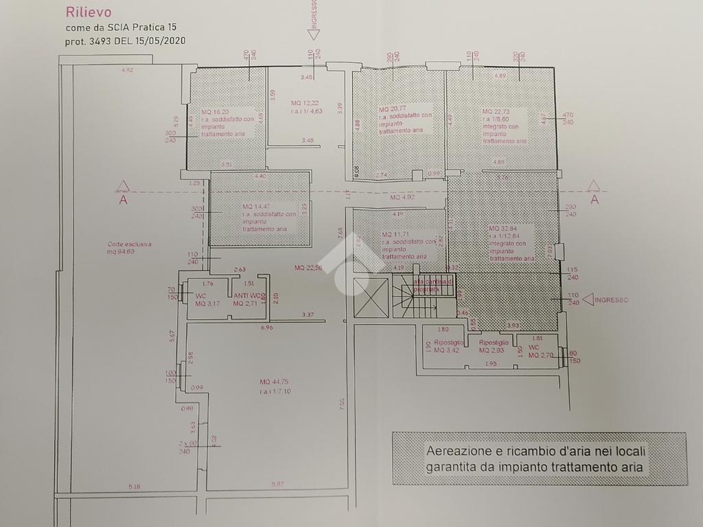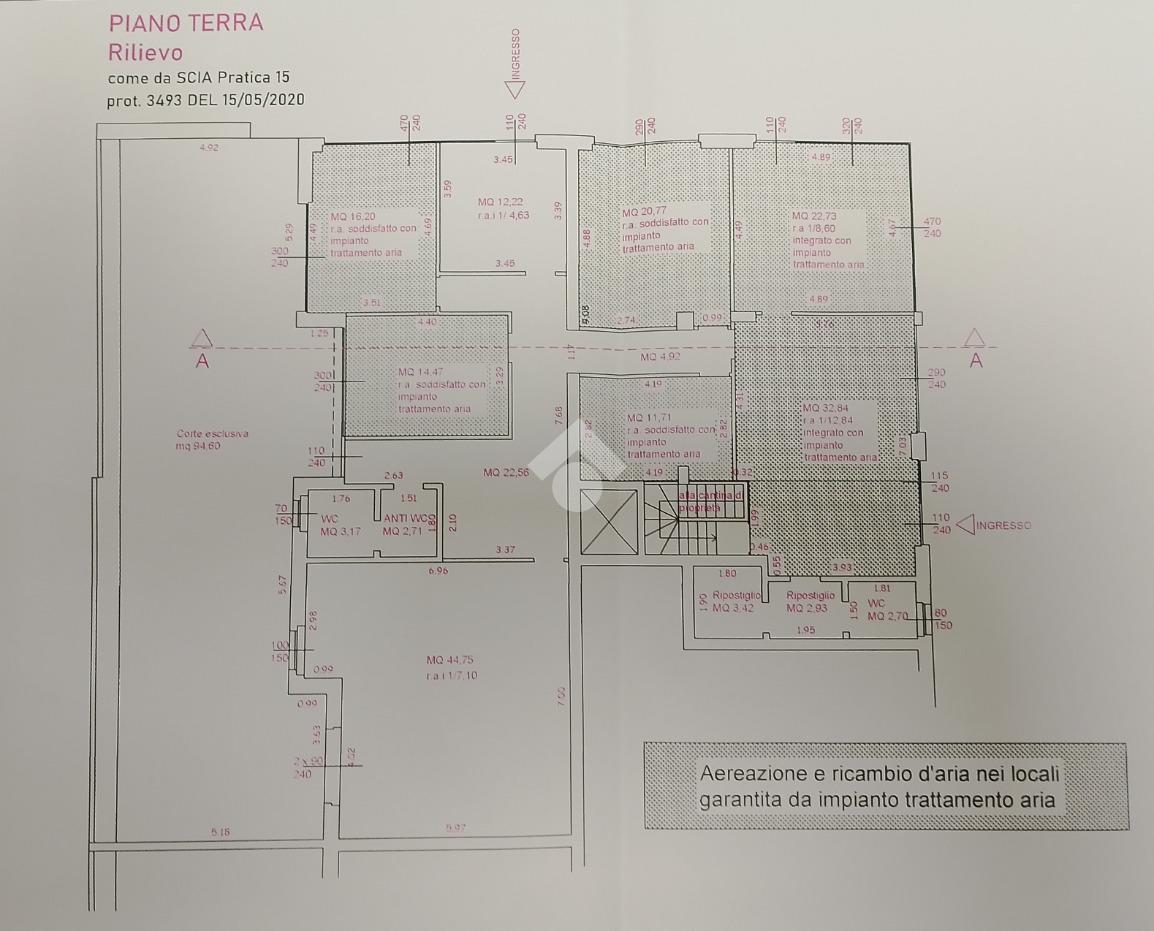 A piano terra si presenta uno spazio di circa 230 mq oltre al portico condominiale esterno, vetrine ad angolo, ingresso pedonale principale ed uno carraio per l’accesso al cortile interno di circa 100 mq. Collegamento diretto tramite porta tra l’immobile e la corte esclusiva.