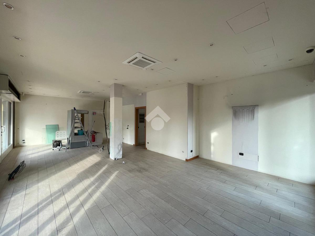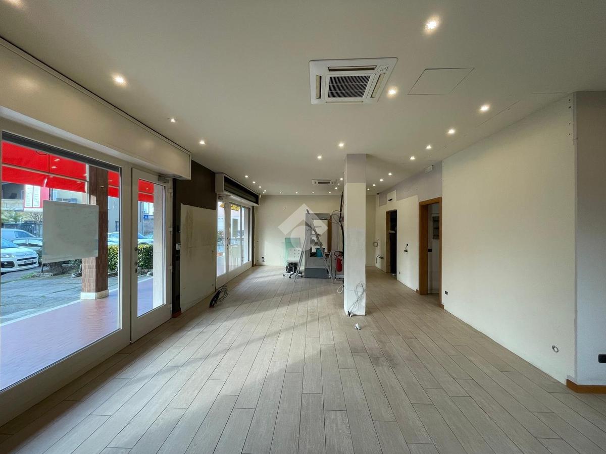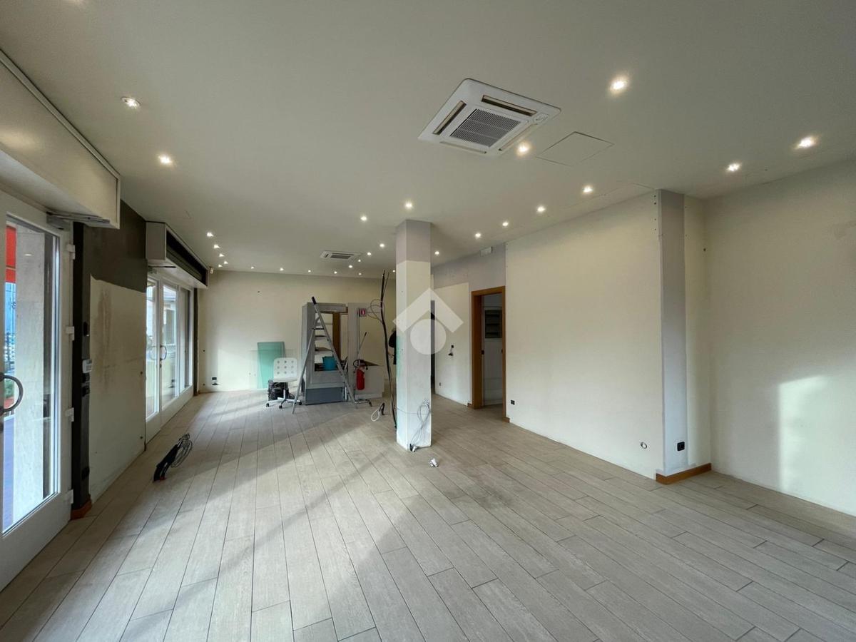 Il negozio presenta un locale principale caratterizzato da 3 vetrine (2 frontali ed una ad angolo) in modo da garantire visibilità ed illuminazione naturale, un disimpegno sul retro che porta ad altri 2 locali oltre all'antibagno e servizio igienico.