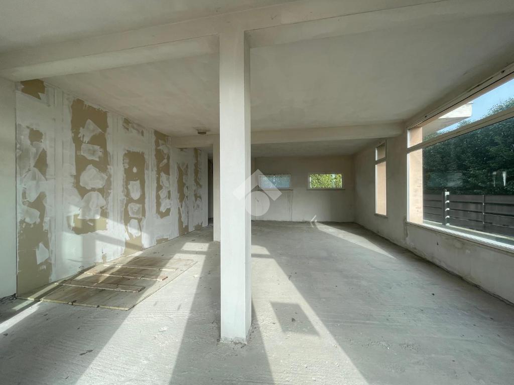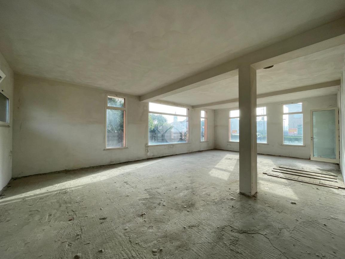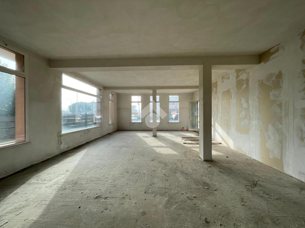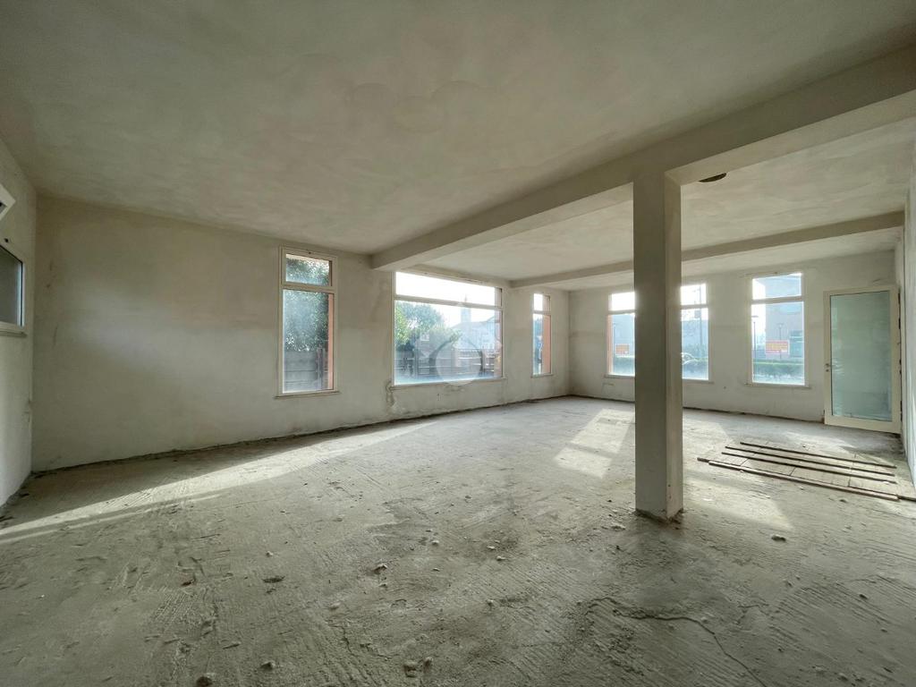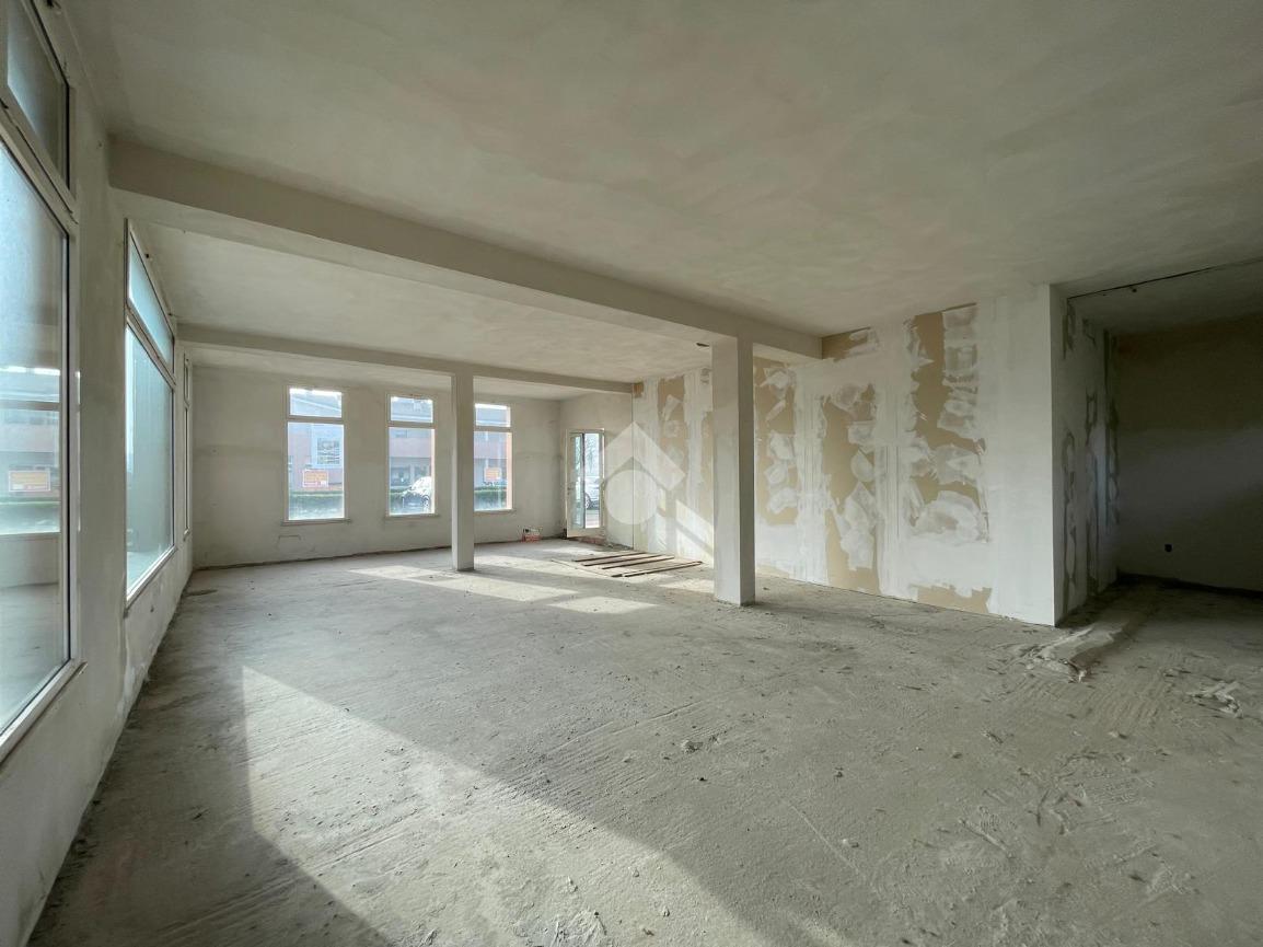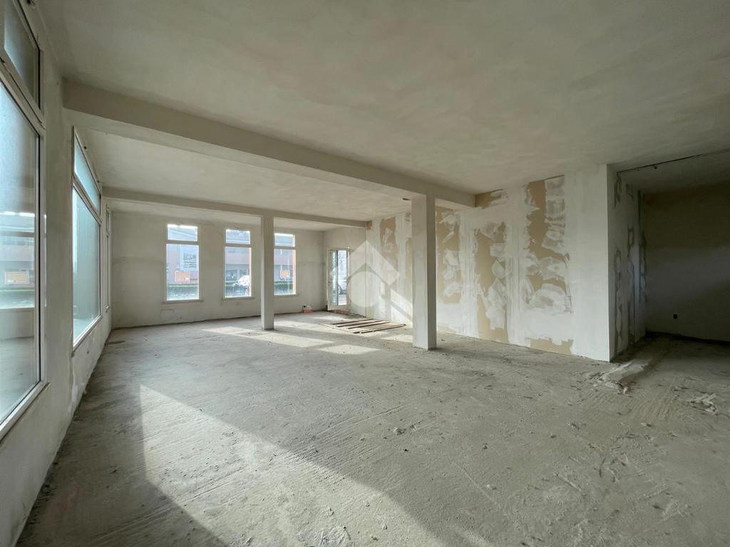 L'immobile è disposto su due livelli collegati tra loro tramite nicchia per scala interna (da realizzare) e tramite un ingresso con rampa esterna condominiale. Al piano terra un open space di circa 100 mq finestrato su tre lati, mentre al piano interrato un locale di circa 50 mq ed alto 2,40 m collegato al negozio e al box auto di circa 15 mq.
